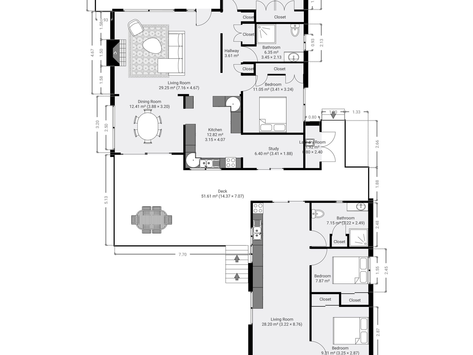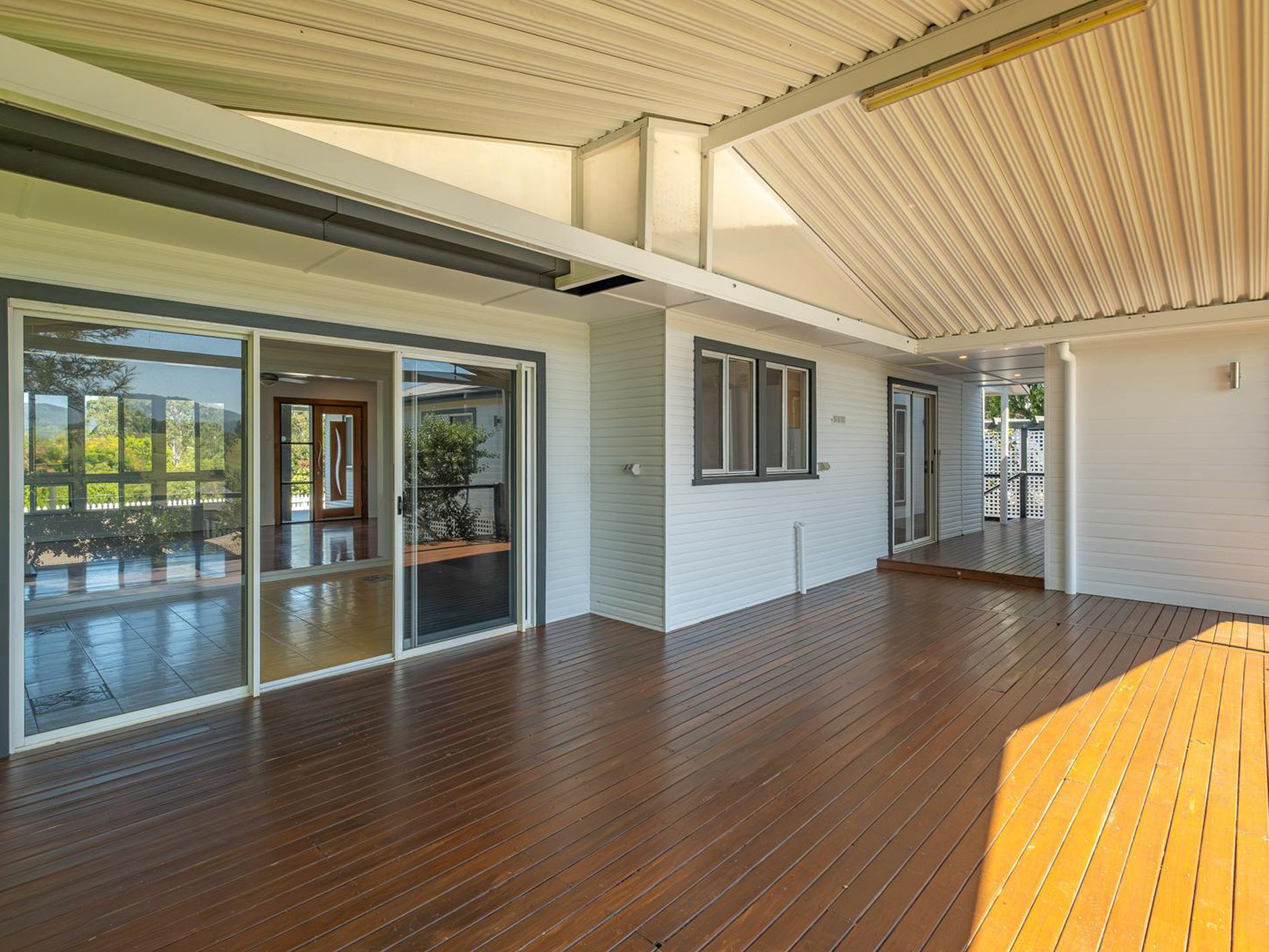 The second home, the newer build also has two spacious carpeted bedrooms also with built in cupboards. A modern kitchen and bathroom, open plan design to incorporate both dining and lounge areas that open out onto a private north facing timber deck.